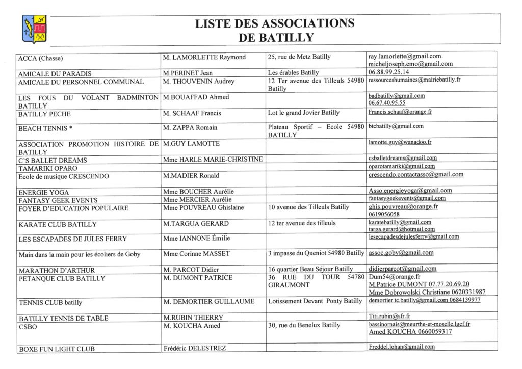 | AMICALE DU PERSONNEL COMMUNAL | M. HOQUIDENT Eric | 3 rue Pasteur 54800 Jouaville | secretariat@mairiebatilly.fr |